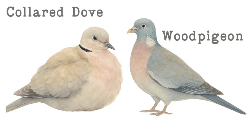 Woodpigeons are large, plump birds with a distinctive white neck patch and a grey body. They are common visitors in gardens and are often seen strutting around looking for seeds. Their cooing sound is low and soothing.